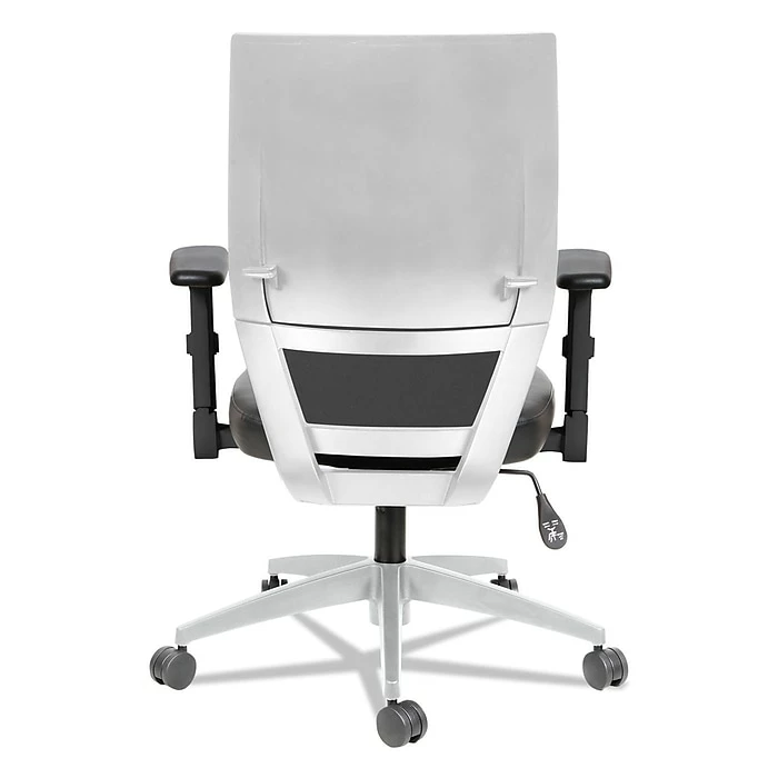 Increase productivity at your workplace with the black Alera Contemporary Executive Chair that is ergonomically designed to provide comfort while working. For extra softness and cushioning, this high-back executive chair has high-quality leather upholstery. This chair has a knee/synchro/center-tilt function that allows you to rest your feet on the floor in an upright or a reclined position. This chair is designed to offer lumbar support by conforming to the curve of your body. It lets you fix the lumbar support and seat at a required height with its adjustable back height and seat depth features.