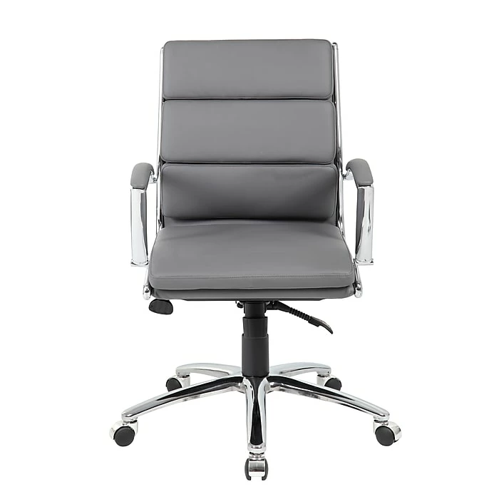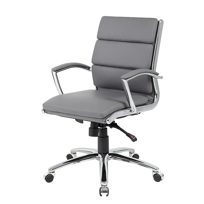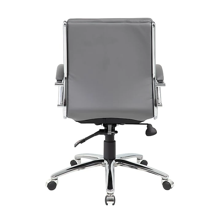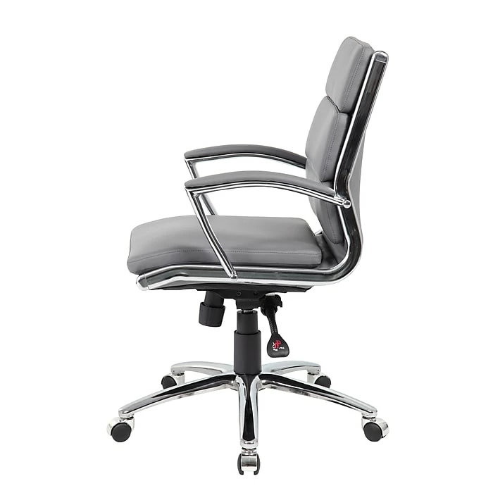This mid back executive chair is beautifully upholstered with soft, durable and breathable grey CaressoftPlus™. This chair features a large 27” chrome base, and metal chrome plated arms topped with soft pads. Pneumatic seat height adjustment and the adjustable tilt tension are controlled by a heavy duty two paddle mechanism.
