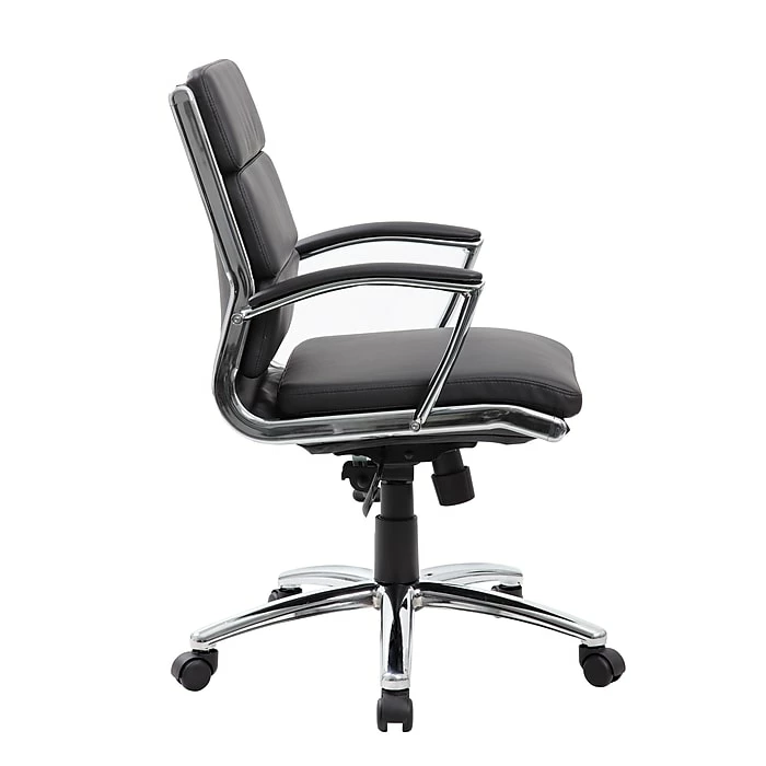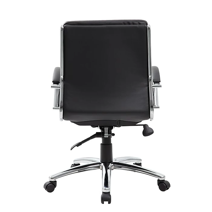 This mid back executive chair is black. This chair features a large 27” chrome base, and metal chrome plated arms topped with soft pads. Pneumatic seat height adjustment and the adjustable tilt tension are controlled by a heavy duty two paddle mechanism.
