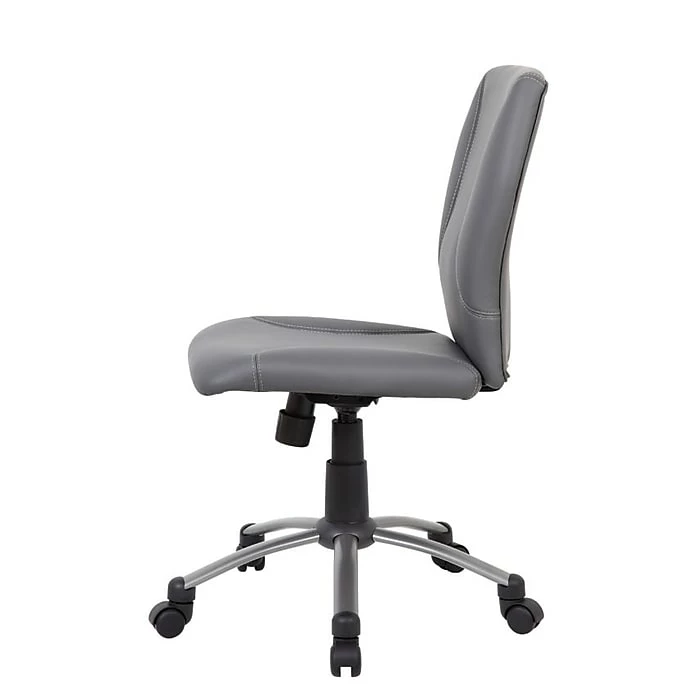 This Tiffany Task Chair is beautifully upholstered in grey CaressoftPlus with double stitching back and seat. It has an elegant and stable Pewter finished base. This contemporary task chair allows for upright locking positions, providing personalized back support for your individual needs. It also provides adjustable tilt tension control, allowing you to customize the optimal angle at which you sit. It has a pneumatic gas lift seat height adjustment, allowing for versatile adjustment of the seat height to suit your comfort and work environment. The hooded double wheel casters make it easy to move and shift directions.
