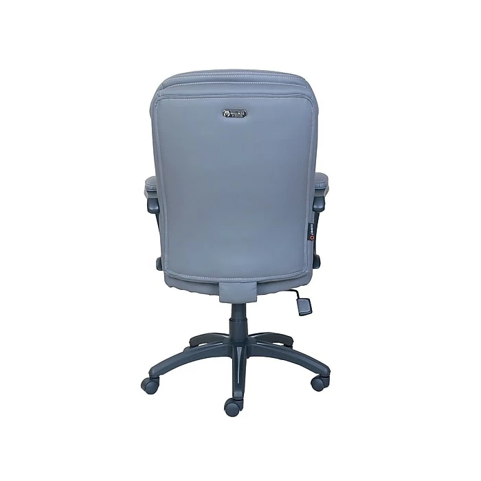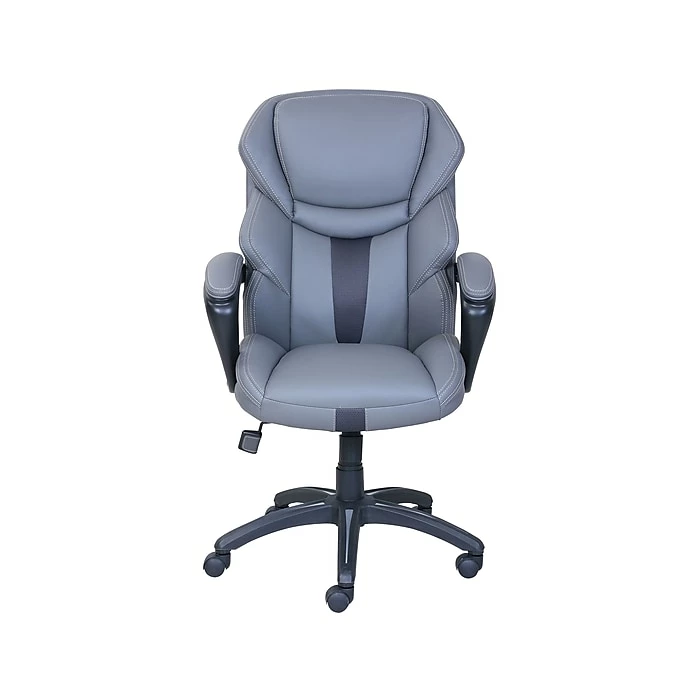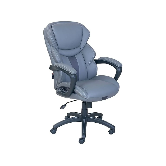 Enjoy all-over comfort as you face each workday with this Dormeo Espo Octaspring manager’s chair. Contoured, segmented cushions cradle your body to provide added support, while the plush elevated headrest relieves stress and strain from tired shoulder and neck muscles. The built-in lumbar support offers added cushion for your lower back, so you can sit restfully as you power through tough tasks. This upscale office furnishing boasts gray bonded leather upholstery and detailed contrast stitching, bringing executive-level style to your corner office. Featuring pneumatic seat lift and tilt tension adjustment options, this Dormeo Espo Octaspring manager’s chair lets you find the perfect seating configuration for your frame and personal preferences.