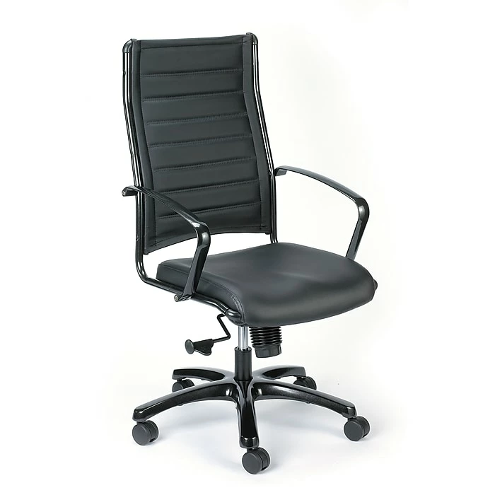 Increase productivity at your workplace with the black Eurotech Seating Executive chair that is ergonomically designed to provide comfort while working. Furnished with high-quality leather upholstery, this executive chair adds a fresh look to your workspace. The oversized foam cushion seat makes this chair comfortable for use even during extended hours of work. This chair has a knee tilt function that allows you to rest your feet on the floor in an upright or a reclined position.