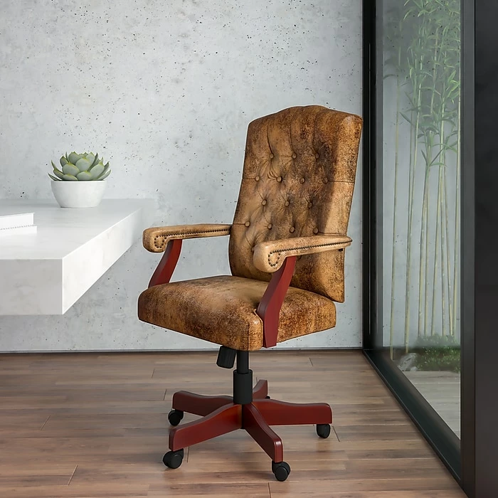 Make a bold design statement with this Flash Furniture executive office chair. The soft ultra-suede upholstery, button tufting and nailhead trim deliver exceptional style, while the mahogany wood accents and classic silhouette imbue you corner office with vintage sophistication. This desk chair features a high-back design and thick foam padding to provide added support for long hours spent on conference calls or in client meetings. Use the dual-wheel casters and swivel seat to move freely about your office without having to leave your seat. With tilt tension, tilt lock and pneumatic seat height adjustment, this Flash Furniture executive office chair offers customizable comfort.