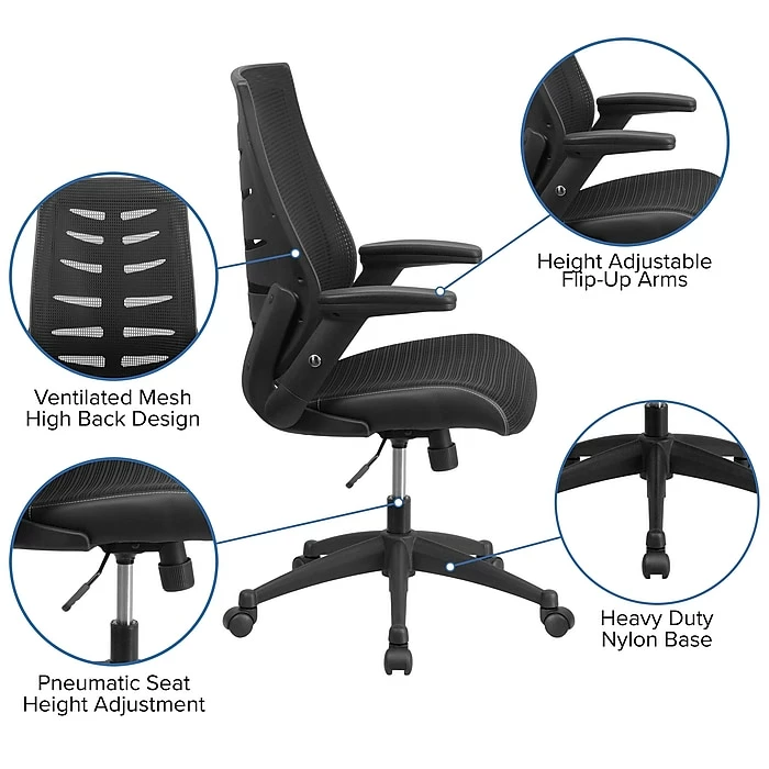 Mesh office chairs can keep you more productive throughout your work day with its comfort and ventilated design. The breathable mesh material allows air to circulate to keep you cool while sitting. Finding a comfortable chair is essential when sitting for long periods at a time. The high back design relieves tension in the lower back, preventing long term strain. The waterfall front seat edge removes pressure from the lower legs and improves circulation. Chair easily swivels 360 degrees to get the max imum use of your workspace without strain. The pneumatic adjustment lever will allow you to easily adjust the seat to your desired height. The multi-function flip-up arms are also height adjustable to take the pressure off the shoulders and the neck, which minimizes the risk of pain. The slim profile of a mesh chair will have your office at the cutting edge.