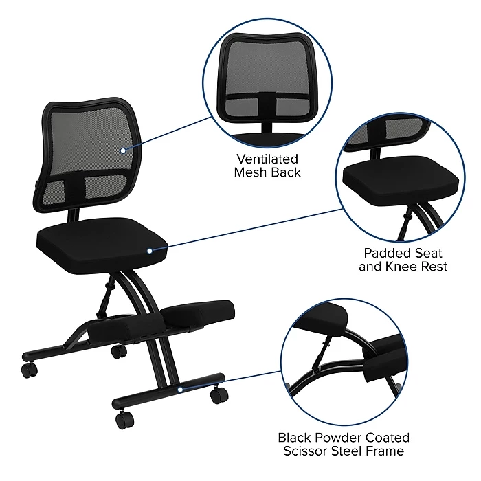 Innovative DesignThe Flash Furniture mobile ergonomic kneeling chair features a gently curved frame that strengthens key back muscles. The back of the Flash Furniture curved mesh-back chair promotes air circulation for coolness, a nd the ergonomic curved frame encourages proper posture in almost any position. An extra layer of cushioning directly beneath the upper thighs and lower spine and the thick pads under the knees offer all-day comfort. Sturdy and Agile FrameWith its four dual-wheel casters, the Flash Furniture kneeling chair is easy to move from one work area to another, making it well suited for multiple users in open office environments. The wide and incrementally adjustable powder-c oated scissor frame supports weights of up to 250 pounds, so it’s versatile enough for shared work spaces. To encourage mobility, the Flash Furniture black mesh chair is light and easy to maneuver.