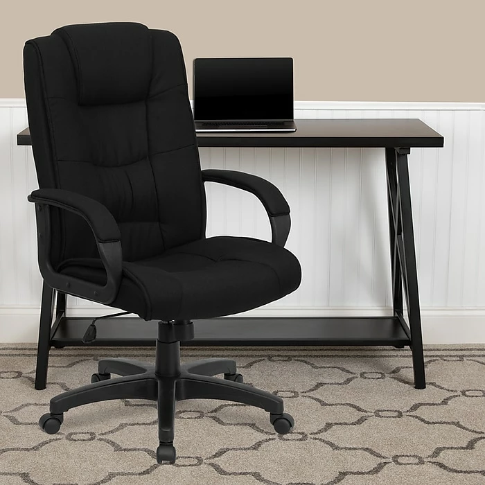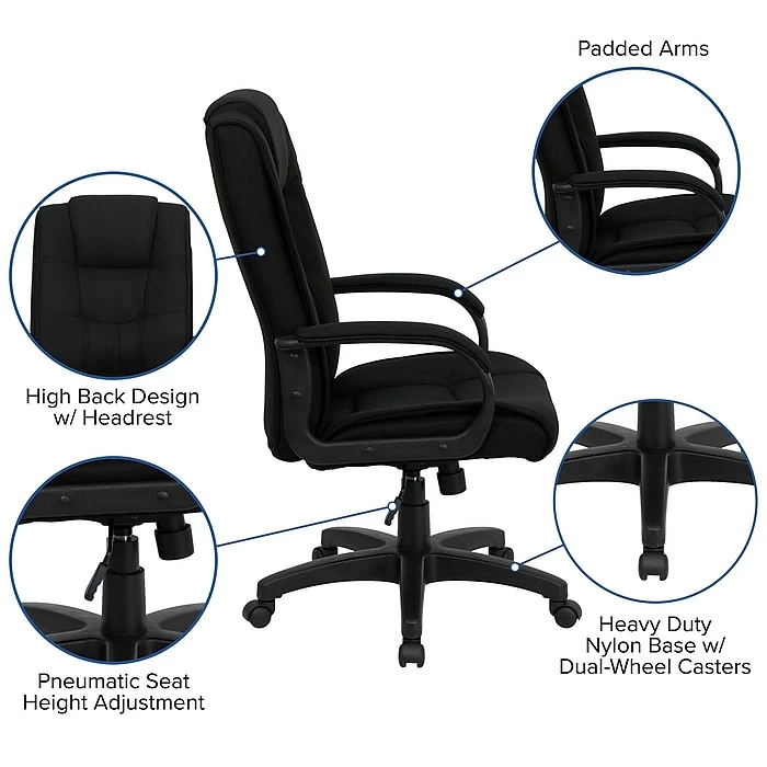 Tackle your most important work comfortably with this Flash Furniture high-back executive chair. The fixed arms feature a sloped design to support your shoulders, arms and hands, while the contoured seat and back come with plush padding for added cushion. Durable fabric upholstery lends a modern look to this chair while also withstanding everyday wear and tear. Featuring a swivel seat and dual-wheel casters, this chair lets you move freely about the office. Find the perfect height for your seat with the pneumatic height adjustment feature, and recline into a more relaxed position with the tilt tension control. With built-in lumbar support, this Flash Furniture high-back executive chair helps relieve stress and strain on tired back muscles.