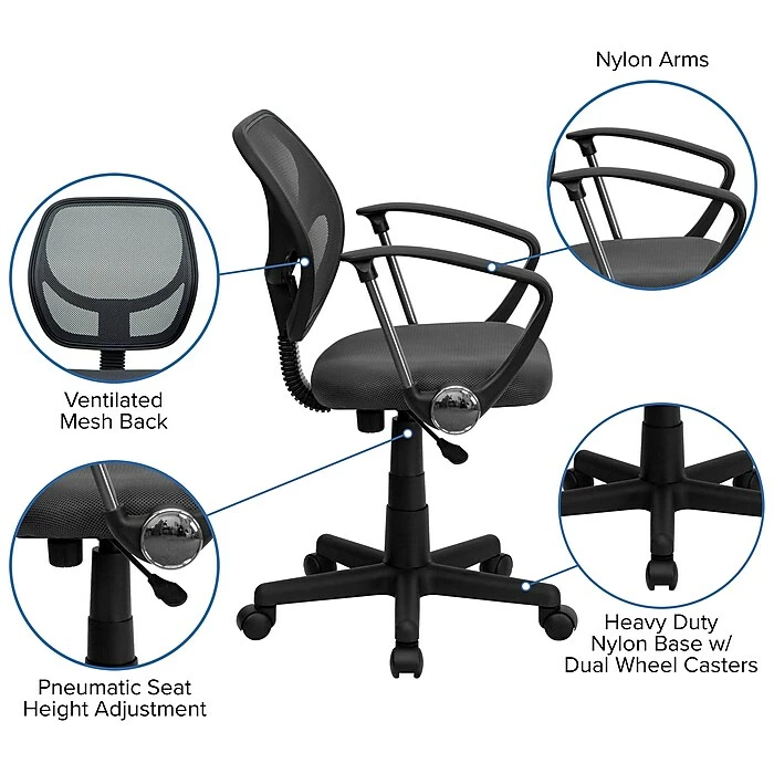 Long working hours are a breeze with this gray Flash Furniture Contemporary Task Chair that guarantees comfort and support. For extra softness and cushioning, this mid-back task chair has high-quality mesh upholstery. Its pneumatic seat height adjustment mechanism feature regulates the chair height and provides a balanced support to lower back. The chair is designed with breathable mesh back and 2-inch thick padded mesh seat for maximum comfort. For safety purpose, this functional chair uses CA117 fire retardant foam cushions.