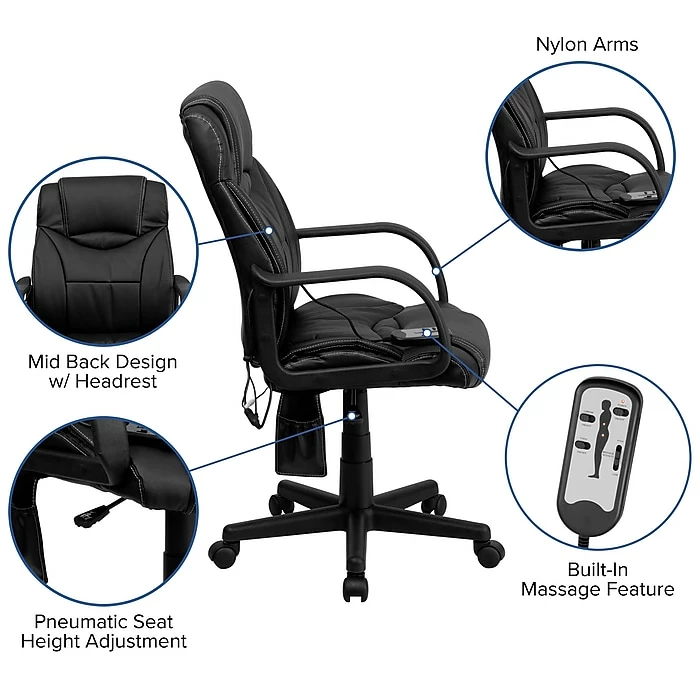 The Flash Furniture high-back executive chair features massaging motors that work over the lumbar region and upper legs to provide a relaxing session while you work. Its LeatherSoft upholstery is a blend of polyurethane and leather to provide soft comfort and excellent durability. This Flash Furniture black executive chair has an integrated headrest to prevent strain to the neck and shoulders.