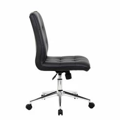 Adjust the customizable tilt control mechanism on this chair to keep your body comfortable. The padded lumbar support system keeps your back supported, while the waterfall seat encourages circulation through long hours at your desk. With its LeatherSoft upholstery that resists stains and contrasting white stitching, this chair is attractive, comfortable and a great addition to any work space. A five-star nylon base and dual wheel casters make this Flash Furniture high-back office chair easy to position and shift throughout the office with ease.