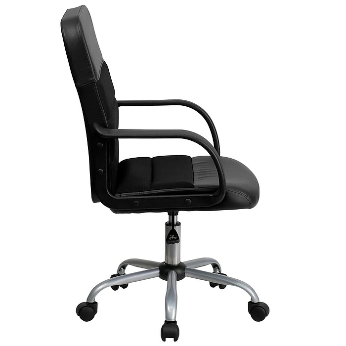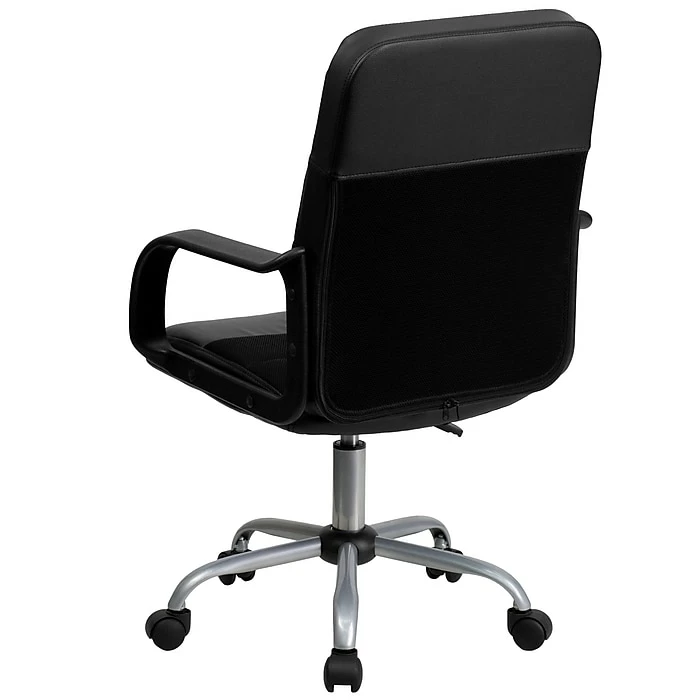 Sit comfortably as you type emails or meet with clients in this Flash Furniture LeatherSoft office chair. The mid-back design offers added support for your frame, while segmented padding provides added cushion for long hours at the office. The mesh upholstery lets air circulate to keep you cooler throughout the day. With luxurious LeatherSoft appointments, this desk chair brings modern style to your workspace. Use the dual-wheel casters to roll from one corner of your office to the other and put the swivel seat to work when you need to transition from the computer to a client meeting. This Flash Furniture LeatherSoft office chair comes with a pneumatic seat height adjustment lever, so you can customize the setup to fit your personal preferences.