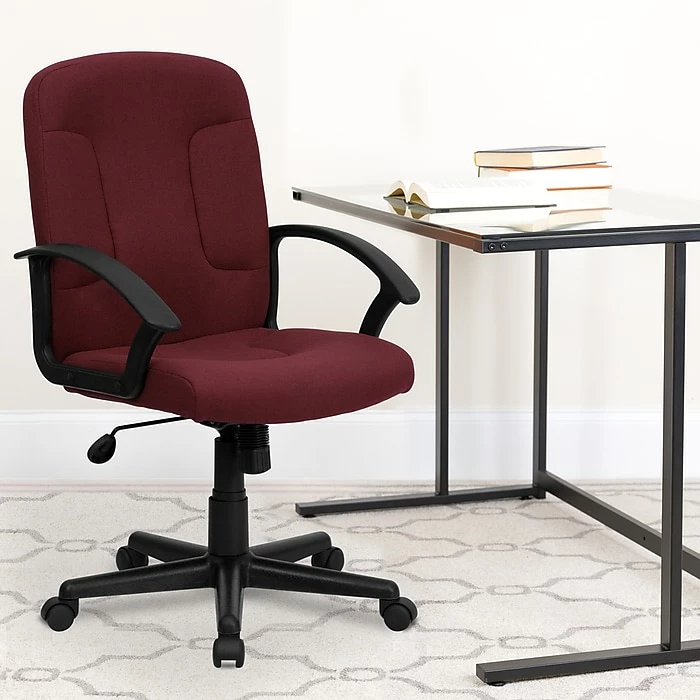 The Flash Furniture Contemporary Task chair in an elegant burgundy shade is perfect for any setup and looks neat and professional. Upholstered with high-quality fabric, this mid-back task chair adds a fresh look to your workspace. Its seat height adjustment mechanism regulates the chair height and provides a balanced support to lower back. You can change the back angle with the help of the tilt mechanism that enables you to recline with ease while reading or working. For ease of movement, this chair comes with a swivel function.