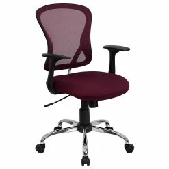 Simple, stylish and supportive, this ergonomic executive chair boasts multiple features designed to provide all-day comfort while adding a touch of contemporary style to the workspace. The contoured back cradles the natural curve of the spine for maximum support. A padded burgundy mesh upholstered seat keeps things cool and comfortable while working for long stretches of time. The Flash Furniture mesh executive chair’s tilt-lock and tilt-tension adjustment features provide customized positioning.