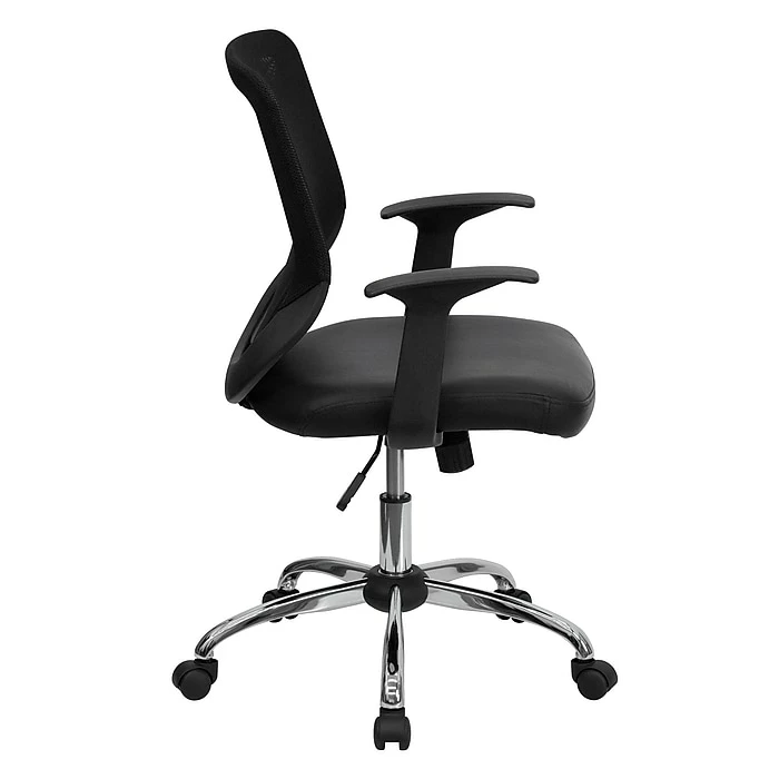 - Black mesh back and leather-upholstered seat for durability and comfort