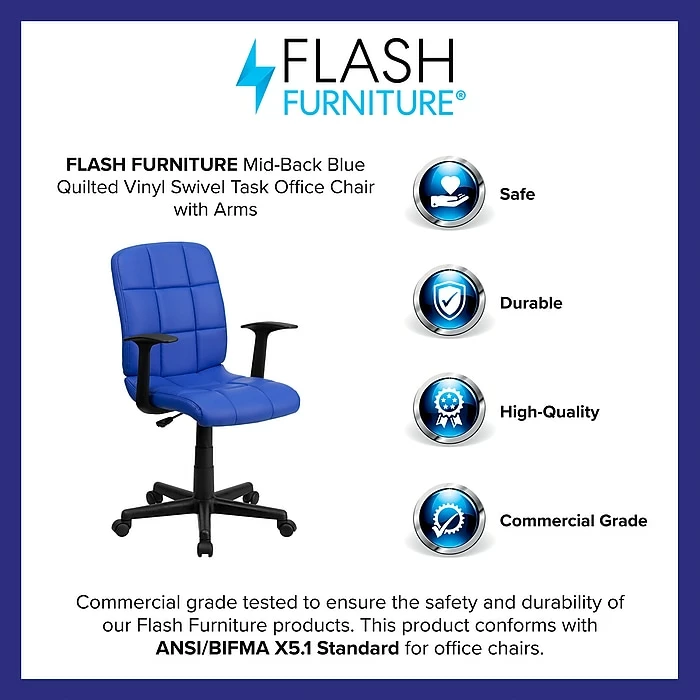 Introduce style and comfort in your workplace with the Flash Furniture Contemporary Task Chair that is available in an attractive blue shade. Upholstered with high-quality vinyl, this mid-back task chair with a beautiful quilted design adds a fresh look to your workspace. Its pneumatic seat height adjustment feature regulates the chair height and provides a balanced support to lower back. The chair is designed with CA117 fire retardant foam cushions for added safety. With the swivel function, this functional chair can rotate in all directions.