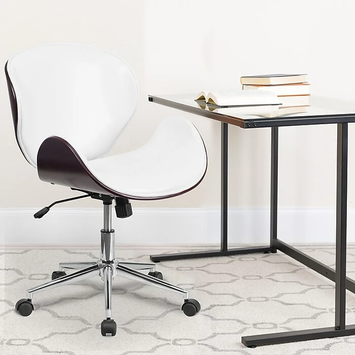 This office chair features a beautiful mahogany bentwood frame with glossy white leather upholstery. This chair is sure to make an impression and become the focal point in your office or home office. A mid-back office chair offers support to the mid-to- upper back region. The contoured backrest provides firm back support. Chair easily swivels 360 degrees to get the maximum use of your workspace without strain. The pneumatic adjustment lever will allow you to easily adjust the seat to your desired heigh t.