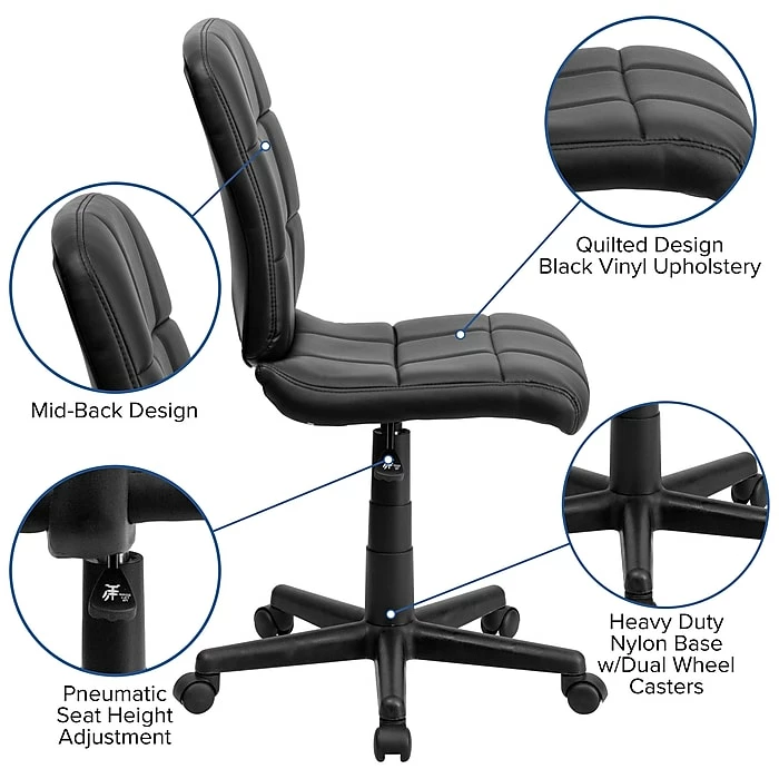 Complete your home office, computer terminal or reception desk with this Flash Furniture office chair. The armless design makes it easy to get in and out of the seat, while the simple silhouette offers a clean, modern look. With black vinyl upholstery, this desk chair is as durable as it is stylish. Plush padding provides added cushioning and support for long hours spent typing or researching, and the swivel seat lets you pivot from one side of your desk to the other. Featuring a thoughtfully positioned pneumatic seat-height adjustment lever, this Flash Furniture office chair lets you find the perfect setup to match your desk.