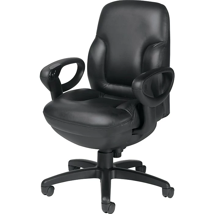 - Adjustable-arm black executive chair with thick, contoured padding to ensure optimal comfort