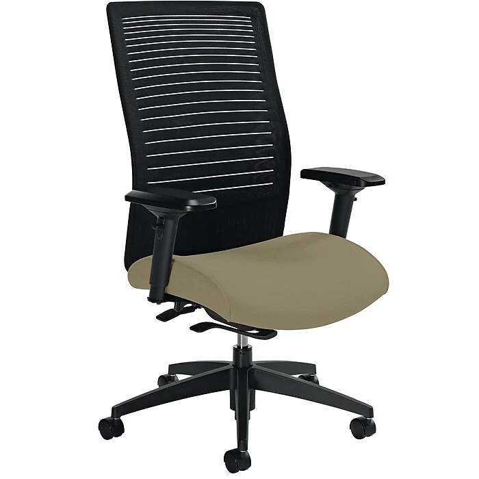 Global Loover High back fabric upholstered synchro-tilter chair in urban sandcastle color has sliding seat depth control & G5 arm caps fulfill user priority. Aluminum finish chair enhances attractive look while nylon governor base gives stability.