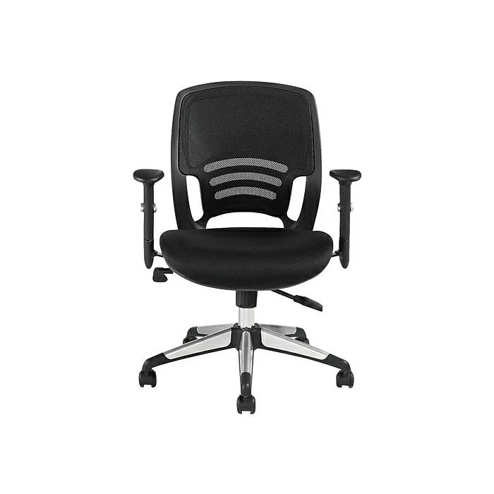 Make working for extended periods of time more comfortable with this black Global mid-back mesh manager’s chair. The supportive seat has an arched five-star base with scuff-resistant tips that help distribute weight evenly, while twin wheel carpet casters roll smoothly on multiple surface types. This chair is made with soft mesh fabric and titanium accents for lightweight breathability and sleek, sophisticated style. An adjustable armrest works alongside the swivel and tilt features, so you can customize the chair to fit your body perfectly.