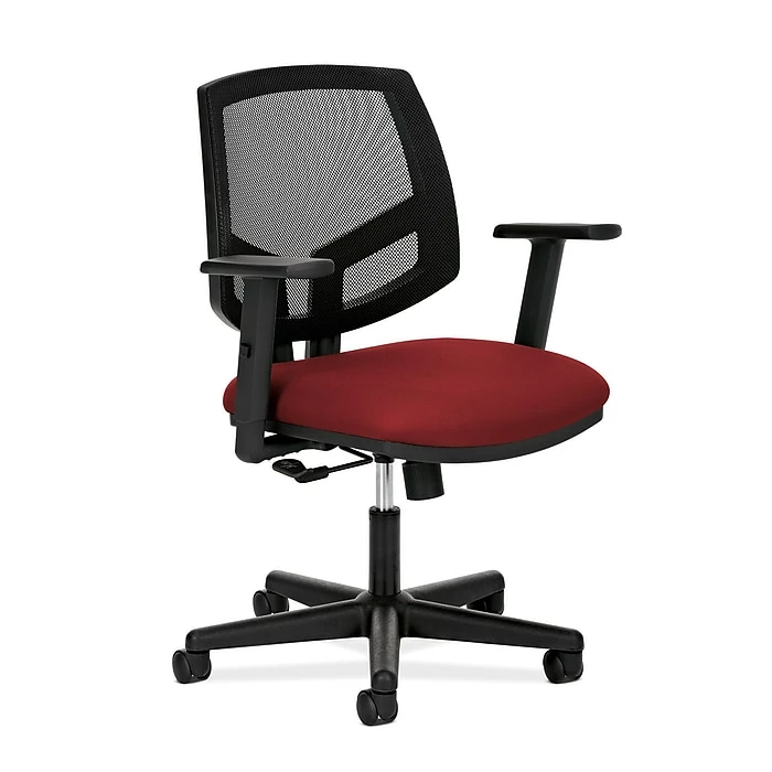 Volt seating from HON offers upscale style, full-scale comfort and impressive quality at a surprisingly affordable price. This mesh back chair with center-tilt has a generous seat cushion and a cooling mesh back for ventilation while performing active office work. Height-adjustable arms are included. Seat upholstery color is Crimson.