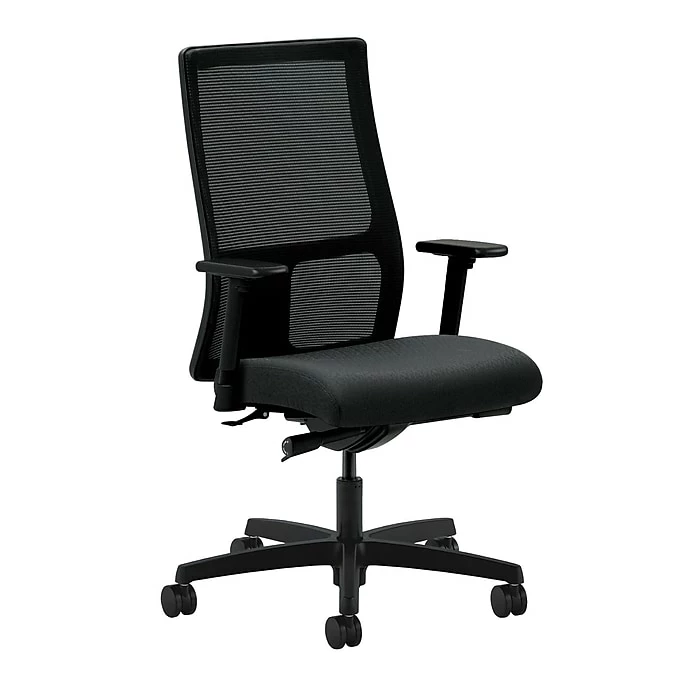 Ignition seating from HON fits your body, your work and your space. This mesh mid-back chair with synchro-tilt is a great blend of style and adjustability, and is excellent for time-intensive activities. Its high recycled content reduces wood waste. Warranted for users up to 300 lbs. Height- and width-adjustable arms are standard for added comfort. Seat upholstery color is Black, and mesh, frame and base color is Black.