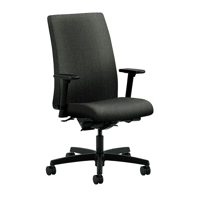 - HON® Ignition® Mid-Back Task Chair, Synchro-Tilt, Back Angle, Adjustable Arms, Iron Ore Fabric