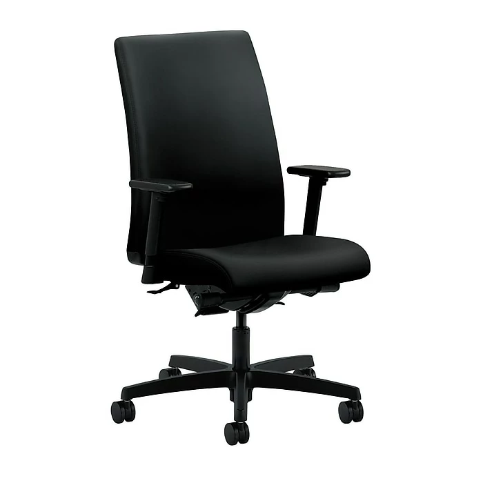 Ignition seating from HON fits your body, your work and your space. This mid-back chair with synchro-tilt and independent back angle offers an exceptional range of motion and is excellent for time-intensive activities. Its high recycled content reduces wood waste. Warranted for users up to 300 lbs. Height- and width-adjustable arms are standard for added comfort. Seat and back upholstery color is Black, and frame and base color is Black.