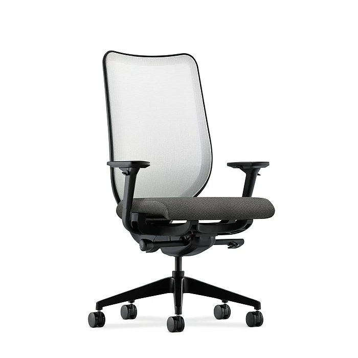 HON Nucleus seating is constructed from innovative materials to deliver comfort from the inside out. This chair also features an ilira-stretch knit back that conforms to your spine. The synchro-tilt and four-position locking further promote proper back alignment. Height- and width-adjustable arms are standard for added comfort. Seat upholstery color is Black, back mesh color is Fog, and frame and base color is Black.
