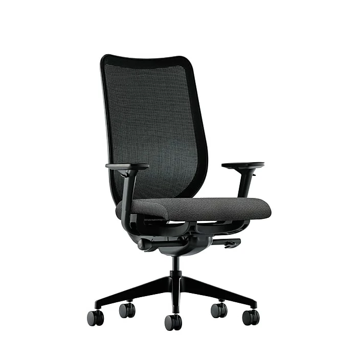 HON Nucleus seating is constructed from innovative materials to deliver comfort from the inside out.. This chair also features an ilira-stretch knit back that conforms to your spine. The synchro-tilt and four-position locking further promote proper back alignment. Height- and width-adjustable arms are standard for added comfort. Seat upholstery color is Iron Ore, back mesh color is Black, and frame and base color is Black.