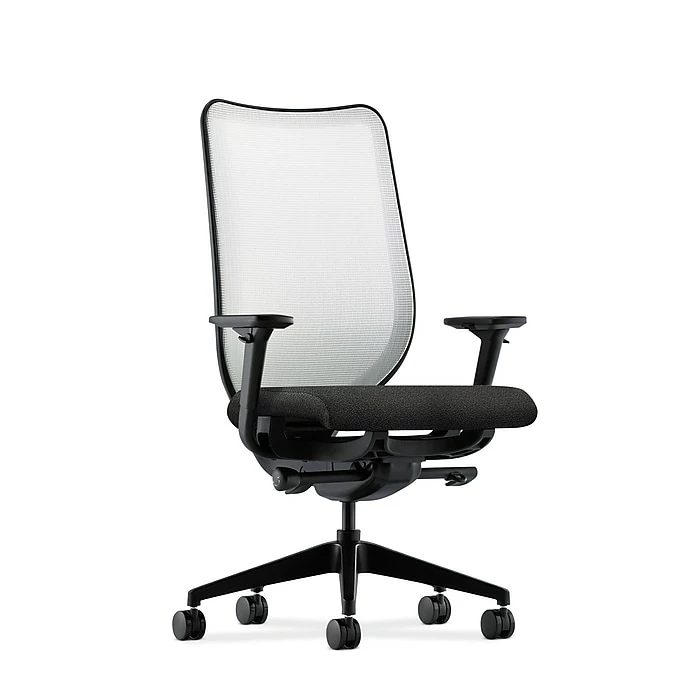HON Nucleus seating is constructed from innovative materials to deliver comfort from the inside out. This chair also features an ilira-stretch knit back that conforms to your spine. The synchro-tilt and four-position locking further promote proper back alignment. Height- and width-adjustable arms are standard for added comfort. Seat upholstery color is Iron Ore, back mesh color is Fog, and frame and base color is Black..