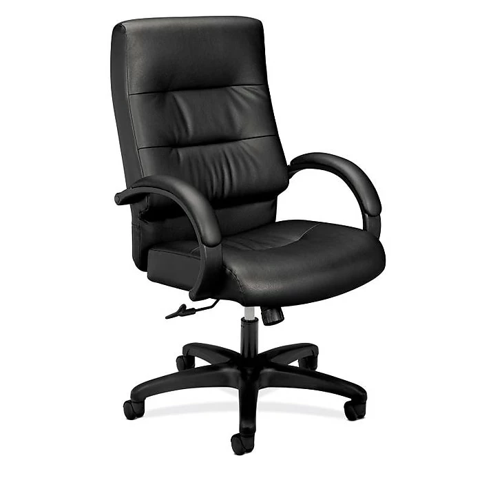 SofThread leather upholstery, an integrated headrest and padded loop arms give this chair an upscale feel at a compelling price. Seat and back SofThread leather color is Black.
