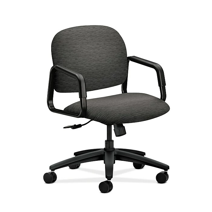 Everywhere you go, people rely on HON 4000 Series Solutions seating for dependability and comfort. This mid-back chair features a floating backrest gives your spine maximum support. The proven center-tilt mechanism allows you to comfortably recline. Fix ed arms are integrated into the frame. Seat and back upholstery color is Onyx, and frame color is Black.