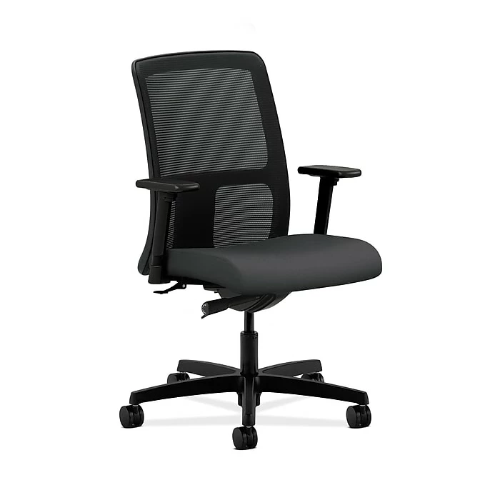 Ignition seating from HON fits your body, your work and your space. This mesh low-back chair with synchro-tilt is a great blend of style and adjustability and is excellent for time-intensive activities. Its high recycled content reduces wood waste. Warr anted for users up to 300 pounds, the height- and width-adjustable arms are standard for added comfort. The seat upholstery color is carbon, and the mesh, frame and base color is black.