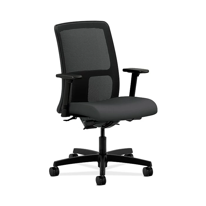 Ignition seating from HON fits your body, your work and your space. This mesh low-back chair with synchro-tilt and independent back angle offers an exceptional range of motion and is excellent for time-intensive activities. Its high recycled content red uces wood waste, and it accommodates users up to 300 pounds. Height- and width-adjustable arms are standard for added comfort. The seat upholstery color is carbon, and the mesh, frame and base color is black.