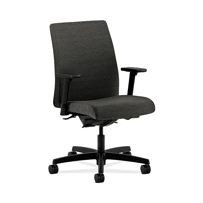 Ignition seating from HON fits your body, your work and your space. This low-back chair with a synchro-tilt and an independent back angle offers an exceptional range of motion and is excellent for time-intensive activities. Its recycled content reduces wood waste. Warranted for users up to 300 pounds, the height- and width-adjustable arms are standard for added comfort. The seat and back upholstery color is onyx, and the frame and base are black.