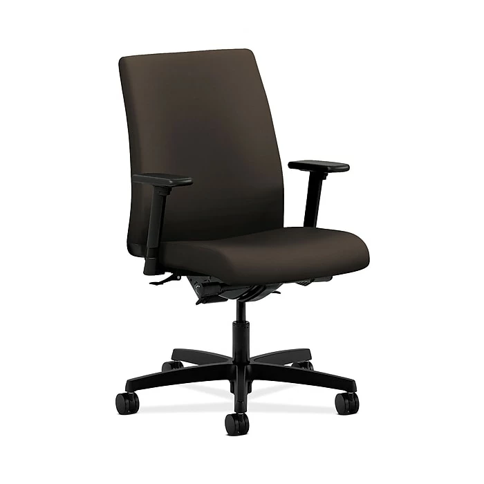 Ignition seating from HON fits your body, your work and your space. This low-back chair with synchro-tilt and independent back angle offers an exceptional range of motion and is excellent for time-intensive activities. Its high recycled content reduces wood waste. Warranted for users up to 300 lbs. Height- and width-adjustable arms are standard for added comfort. Seat and back upholstery color is Espresso, and frame and base color is Black.