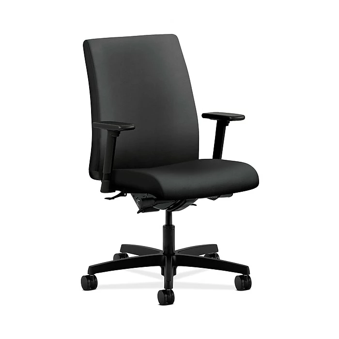 Ignition seating from HON fits your body, your work and your space. This low-back chair with synchro-tilt and independent back angle offers an exceptional range of motion and is excellent for time-intensive activities. Its high recycled content reduces wood waste. This chair is warranted for users up to 300lbs. Height- and width-adjustable arms are standard for added comfort. The seat and back upholstery color is onyx, and the frame and base color is black.