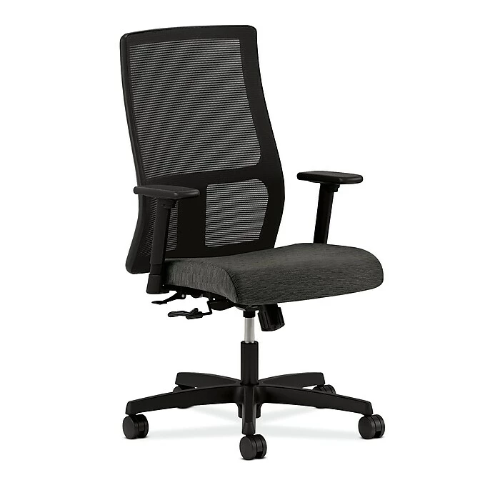 Ignition seating from HON fits your body, your work and your space. This mesh mid-back chair with center-tilt features adjustments not often found in its category, and is excellent for time-intensive activities. Its high recycled content reduces wood wa ste. Warranted for users up to 300 lbs. Height- and width-adjustable arms are standard for added comfort. Seat upholstery color is Onyx, and mesh, frame and base color is Black.