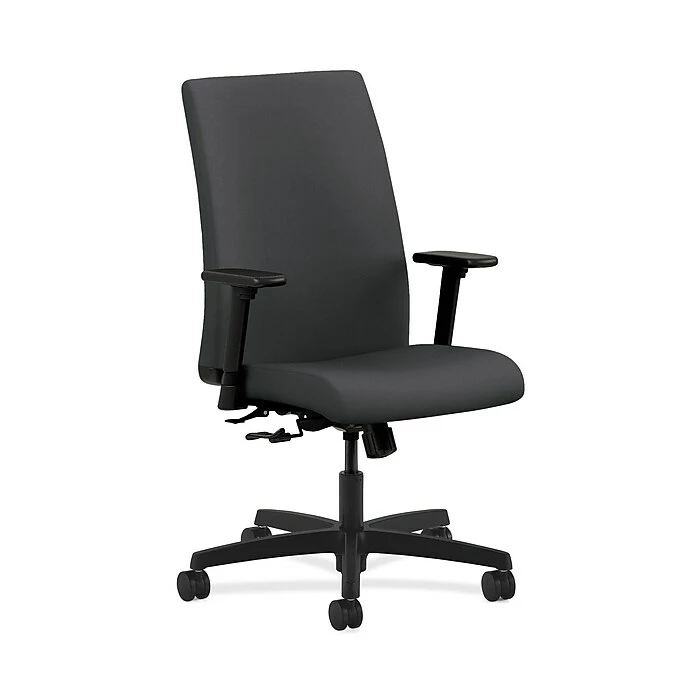 Ignition seating from HON fits your body, your work and your space. This mid-back chair with center-tilt features adjustments not often found in its category, and is excellent for time-intensive activities. Its high recycled content reduces wood waste. Warranted for users up to 300 lbs. Height- and width-adjustable arms are standard for added comfort. Seat and back upholstery color is Carbon, and frame and base color is Black.