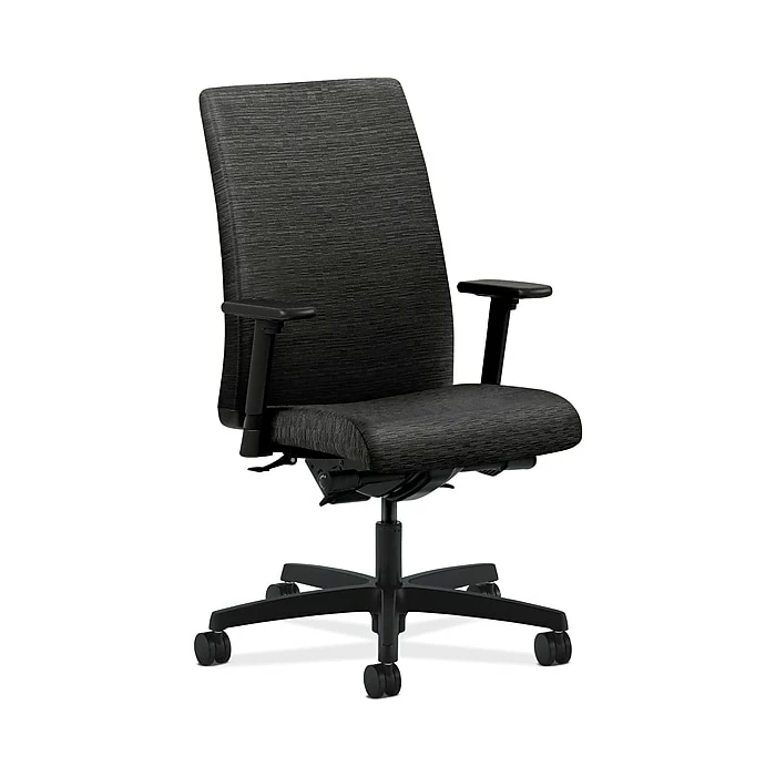 Ignition seating from HON fits your body, your work and your space. This mid-back chair with synchro-tilt and independent back angle offers an exceptional range of motion and is excellent for time-intensive activities. Its high recycled content reduces wood waste. Warranted for users up to 300 lbs. Height- and width-adjustable arms are standard for added comfort. Seat and back upholstery color is Onyx, and frame and base color is Black.