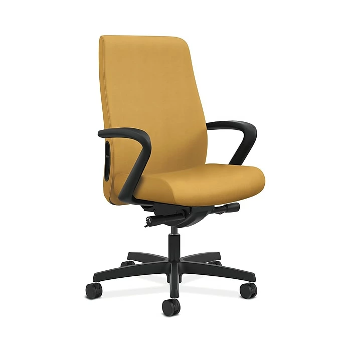 Endorse is The HON Company’s most adaptable seating collection. This mid-back task chair features adaptable comfort geometry with the added benefit of an easy-to-use built-in lumbar adjustment for exceptional lower back support. Synchro-tilt promotes ci rculation and spinal alignment, and the standard pneumatic height and seat glide controls accommodate people of varying heights. Fixed arms help support the forearms and shoulders. Rated for users up to 300 lbs. Black frame with mustard upholstery.