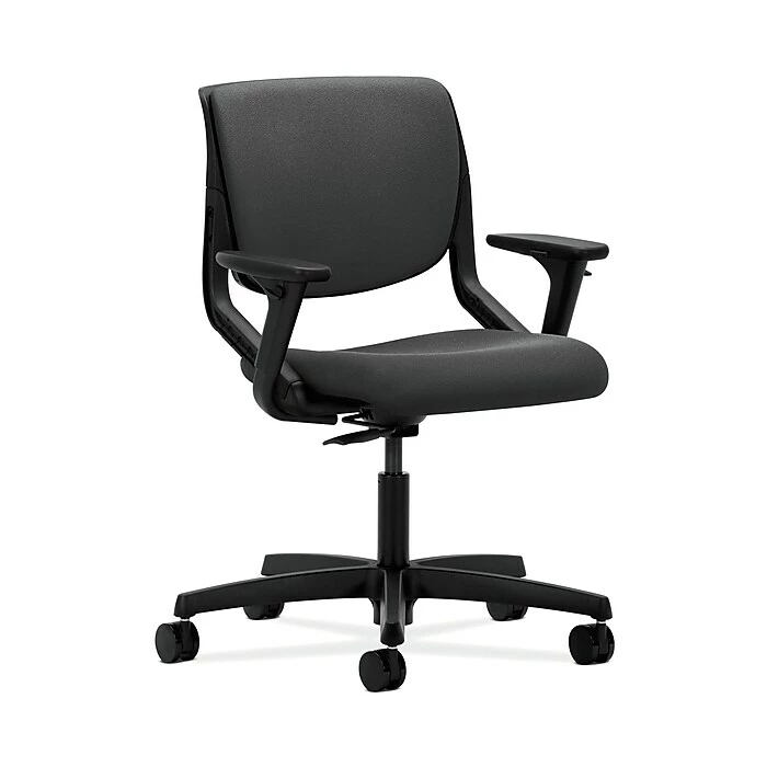 HON Motivate seating transforms any space into a dynamic environment. This task chair incorporates both great style and good ergonomics. The flex-back motion helps support the spine. Shell color is Onyx, back and seat upholstery color is Iron Ore, and b ase is Black.
