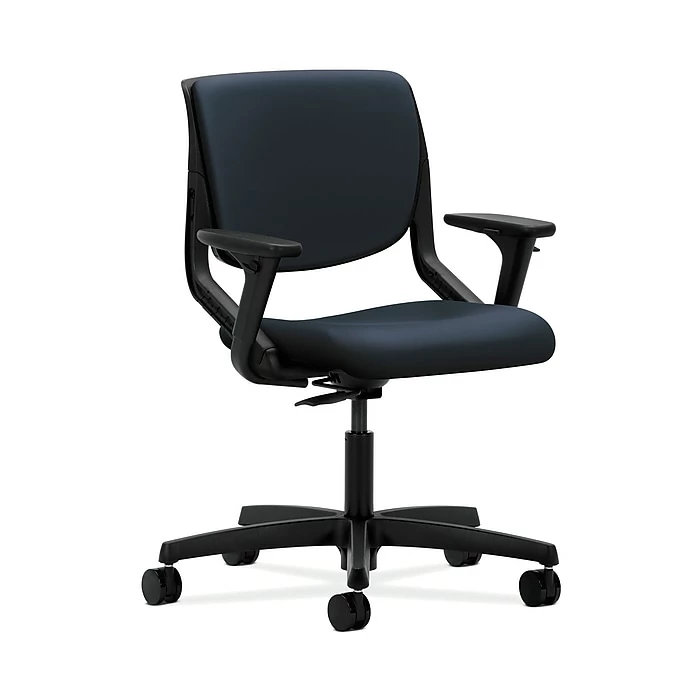 HON Motivate seating transforms any space into a dynamic environment. This task chair incorporates both great style and good ergonomics. The flex-back motion helps support the spine. Shell color is Onyx, back and seat upholstery color is Navy, and base is Black.