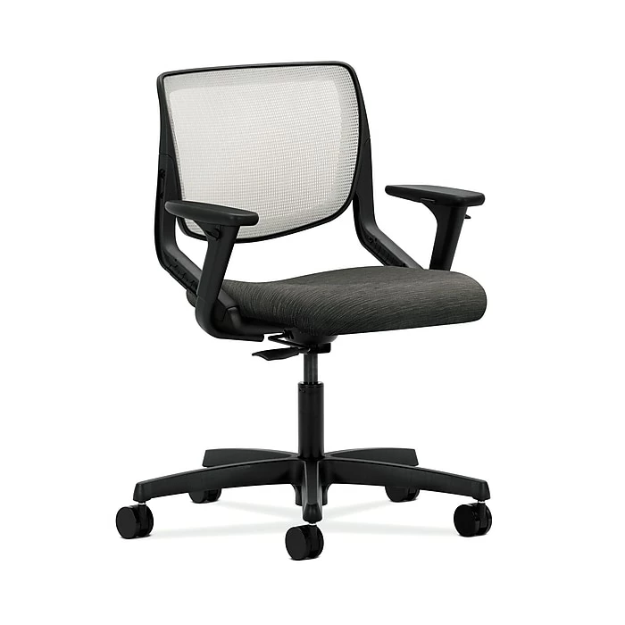 HON Motivate seating transforms any space into a dynamic environment. This task chair incorporates both great style and good ergonomics. The flex-back motion helps support the spine. Back is Fog ilira -stretch knit, seat upholstery color is Onyx, and ba se is Black.