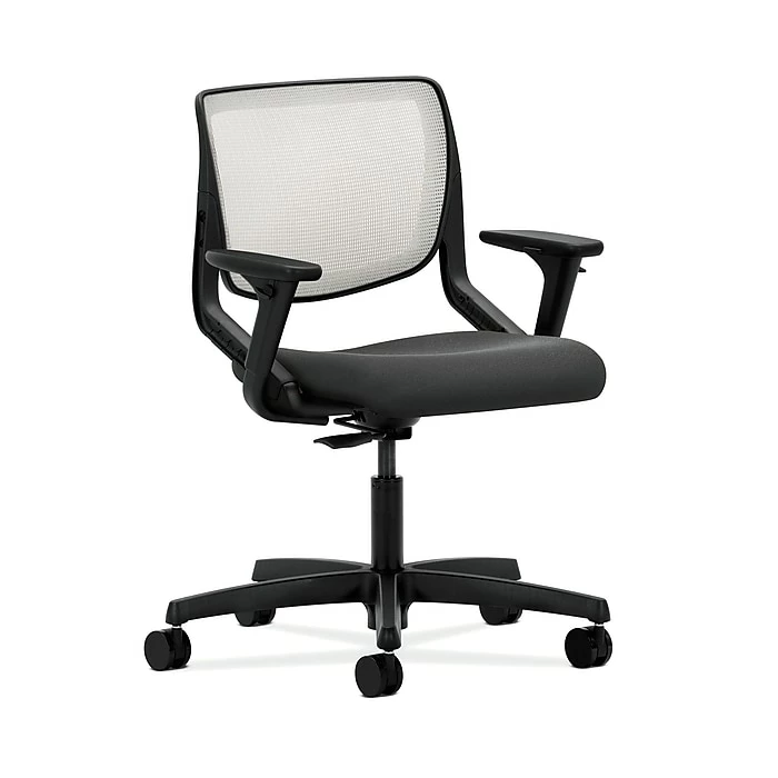 HON Motivate seating transforms any space into a dynamic environment. This task chair incorporates both great style and good ergonomics. The flex-back motion helps support the spine. Back is Fog ilira -stretch knit, seat upholstery color is Iron Ore, an d base is Black.