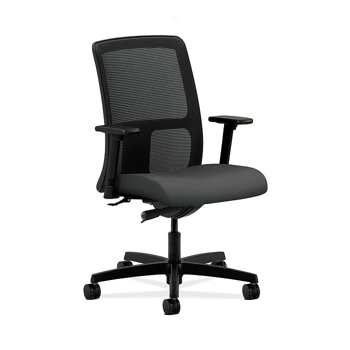 Ignition seating from HON fits your body, your work and your space. This mesh low-back chair with synchro-tilt is a great blend of style and adjustability and is excellent for time-intensive activities. Its high recycled content reduces wood waste. This chair is warranted for users up to 300 lbs. Height- and width-adjustable arms are standard for added comfort. The seat upholstery color is iron ore, and the mesh, frame and base color is black.