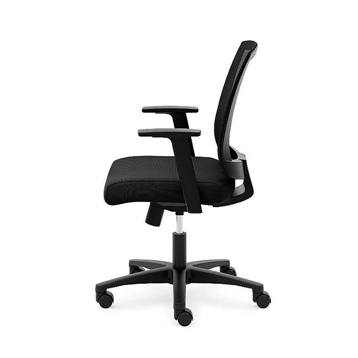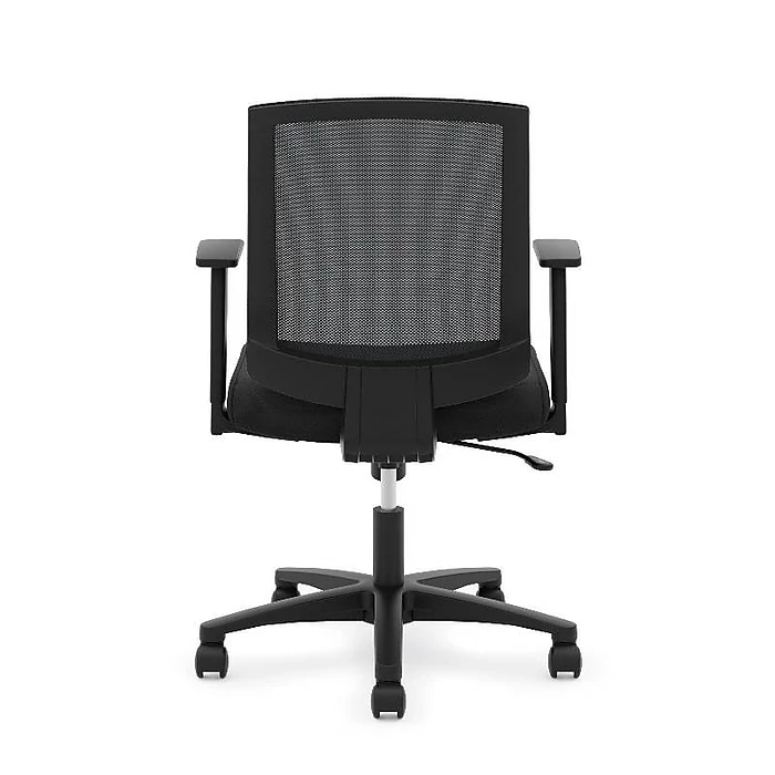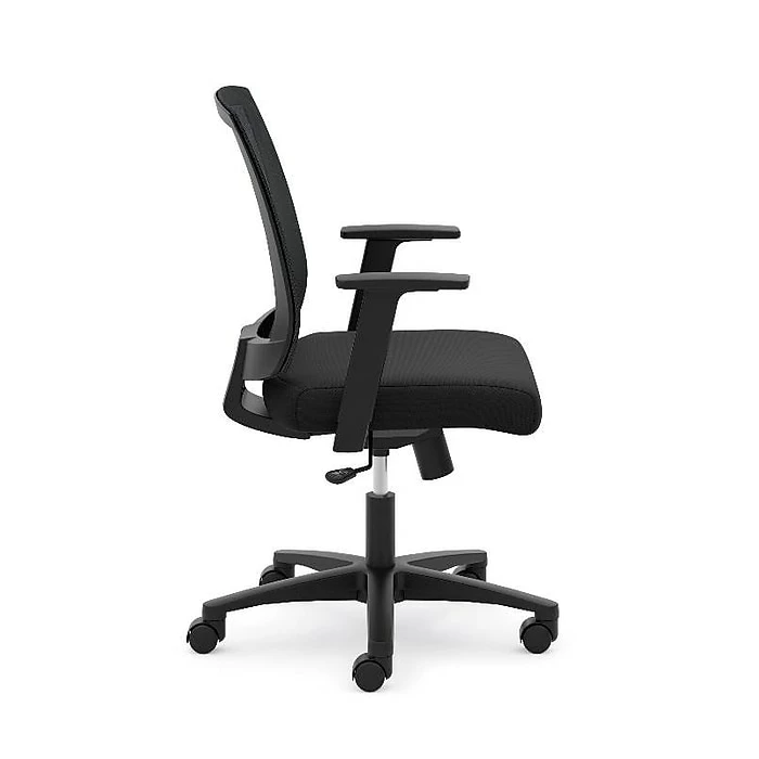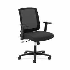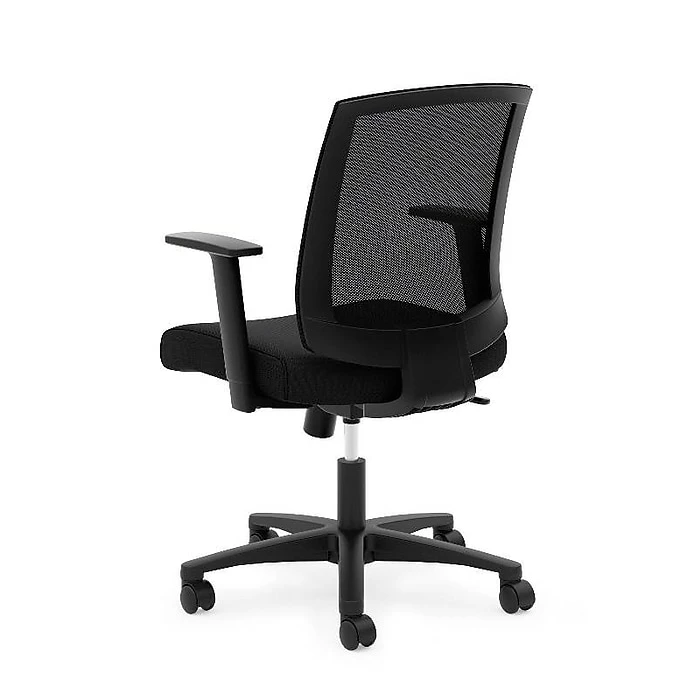 The breathable mesh back is contoured to offer total body support. Sculpted fixed arms allow users to rest their forearms while typing. Convenient center-tilt control features adjustable tension and upright lock to provide choices in posture. Back mesh, frame and seat upholstery color is Black.