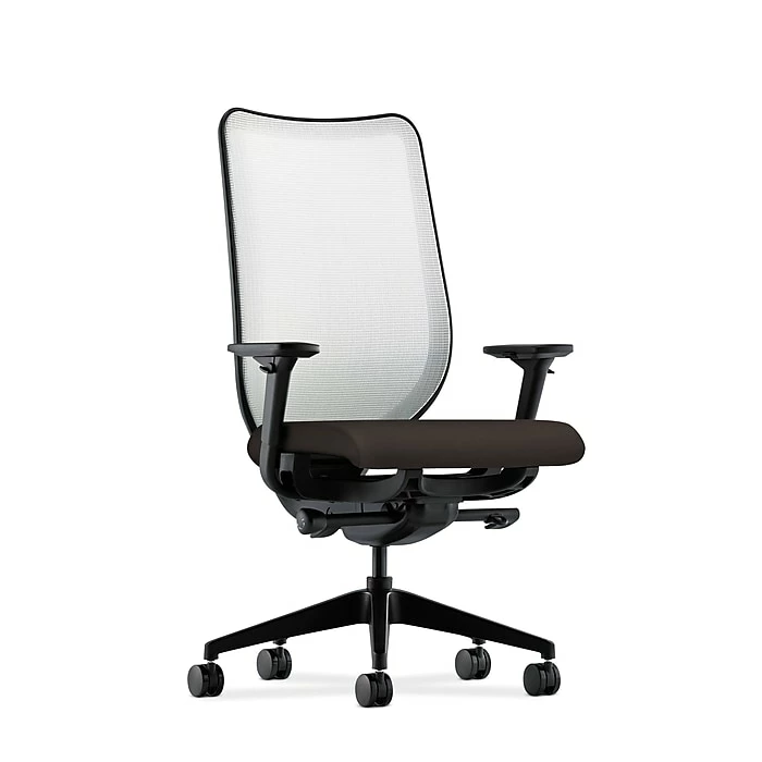 HON Nucleus seating is constructed from innovative materials to deliver comfort from the inside out. This chair also features an ilira-stretch knit back that conforms to your spine. The synchro-tilt and four-position locking further promote proper back alignment. Height- and width-adjustable arms are standard for added comfort. Seat upholstery color is Onyx, back mesh color is Fog, and frame and base color is Black.