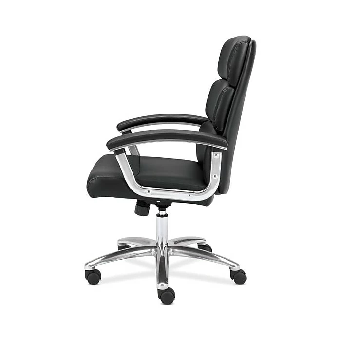 SofThread leather upholstery, a waterfall seat edge and Polished Aluminum arms and base give this chair an upscale feel at a compelling price. Seat and back SofThread leather color is Black.