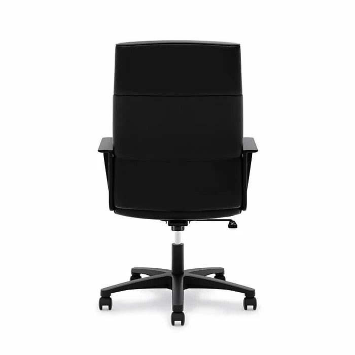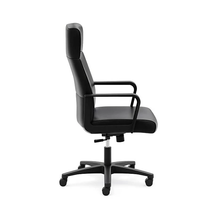 The articulated back cushions and contemporary tapered loop arms add to the modern appeal. The integral headrest provides support and comfort. Convenient center-tilt control features adjustable tension and upright lock to provide choices in posture. Upholstery is Black SofThread leather; base and arms are Black.